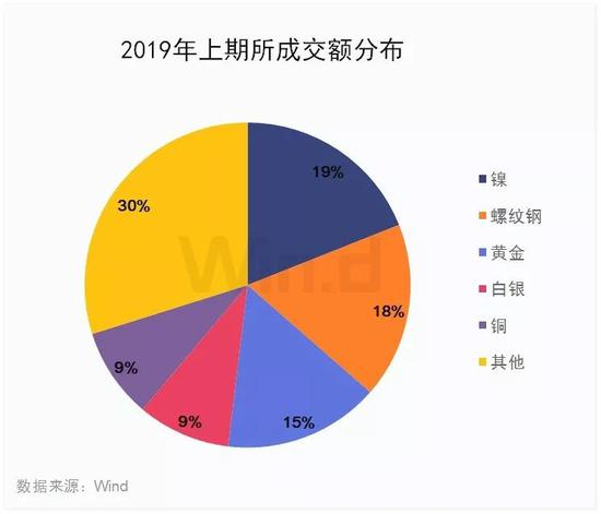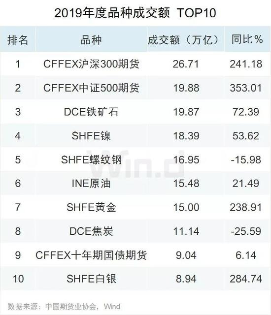 2019年金融期货成交额随着股市的活跃而大幅上升,沪深300股指期货成交额以26.71万亿元成为成交额冠军品种,成交额同比大涨241.18%,中证500股指期货以及10年期国债期货分列2019年度品种成交额排行榜第二、第九位;铁矿石期货以19.87万亿雄踞商品期货成交额榜首,成交额占大商所成交额的28.83%,沪镍以18.39万亿位列商品期货成交金额第二位。