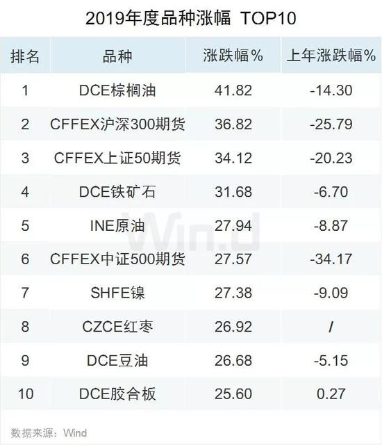 2019年商品期货以及金融期货均有强劲表现。大商所棕榈油以41.82%涨幅位列涨幅榜第一,沪深300股指期货以及上证50期货以36.82%以及34.1%位于涨幅榜第二、第三名。