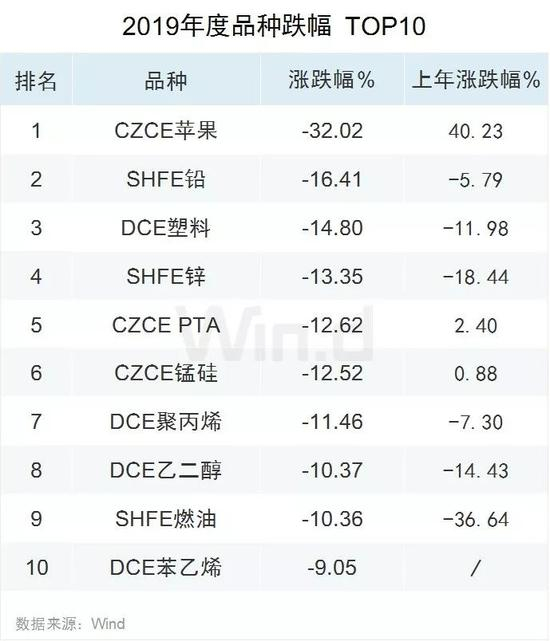 苹果、沪铅和塑料分别位列跌幅榜前三。苹果跌幅为32.02%,但2018年以40.23%的年度涨幅位列期货市场涨幅榜第一。