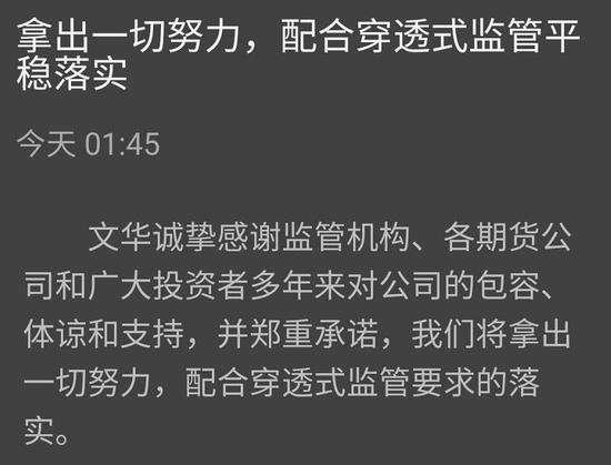 1月12日凌晨,文华财经向业内发布了致歉通知“拿出一切努力,配合穿透式监管平稳落实“。表示向各期货公司免费提供中台系统的全套软件产品和相关技术支持。
