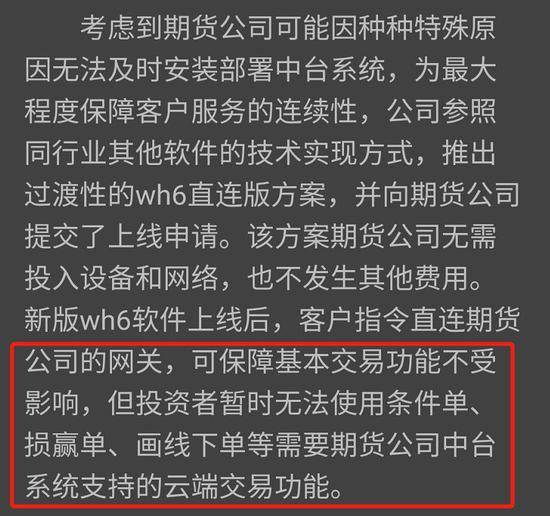 值得注意的是,在没有布置中台系统之前,投资者基本行情交易功能不受影响,但条件单、损盈单、画线下单等功能无法支持。同时,客户使用的文华随身行手机交易软件以及客户自己购买的WH7、WH8、WH9软件的交易功能也不能继续使用。