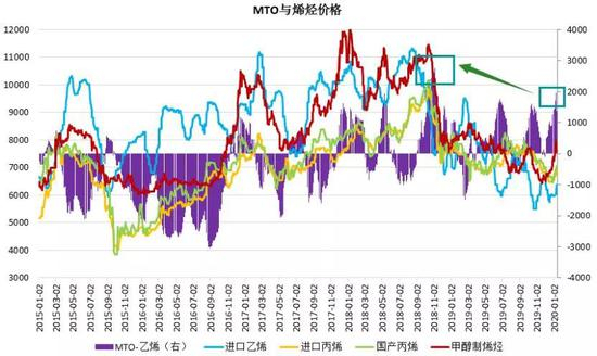乙烯/MTO替代方面,参考2018年发生替代时的价差,再结合当前MTO及乙烯的价格情况,假设乙烯价格不变的情况下,我们静态预估乙烯替代给予甲醇现货的上限大概在2500元/吨附近。
