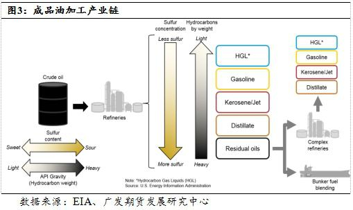 成品油是指原油的馏分产物,按照馏分温度分为汽油、石脑油、煤油、柴油、燃料油等。船舶燃料用油又分为两种类型,分别是馏分型船用油和残渣型船用油,其中馏分型船用油可简单分为MGO和MDO,均属于柴油馏分,但粘度不同。MGO是轻质柴油,作为高速柴油机用油,MDO是重柴油,作为中速柴油机用油;残渣型船用油特指船用燃料油,根据50℃时运动粘度的差异,分为180CST、380CST、500CST等种类,主要用作国际航运大中型船舶燃料用油。