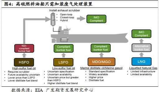 航运业占全球原油需求总量的比例约为5%,且大部分船舶以价格较低的重质燃料油作为燃料。在IMO的新法规生效后,船东可采取使用低硫(含硫0.5%)燃料油和柴油、安装船用脱硫装置(EGC系统)以及使用其他清洁燃料替代等措施。但从成本角度出发,船舶安装脱硫装置无疑是权宜之计,而使用清洁燃料的改造成本过大,因此,我们预计使用低硫燃料油和柴油作为替代将是主流方式。