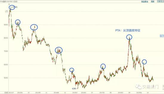 在回顾 PTA 下跌的主要因素之前,我们来看一下 PTA 这个品种的特点,我们可以看一下 PTA 指数的历史 K 线图,你会发现一个非常明显的特点,就是顶部特征非常明显,即尖顶,而底部相对不太好确认,底部相对平缓一些,基本上是尖顶圆底的特征。