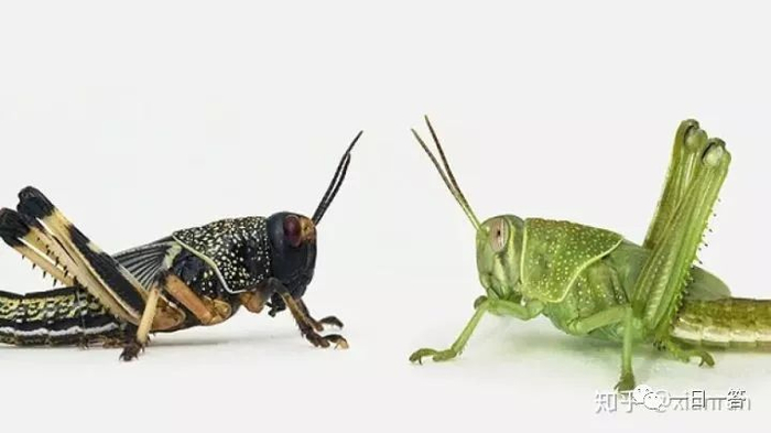 蝗虫刚出生的时候,是独居、温和、害羞,危害不大的状态。但是,一旦聚集到60只以上,蝗虫颜色就会变化,性格也会变化,变得特别暴躁、富攻击性、食欲也大增,并开始成群行军。