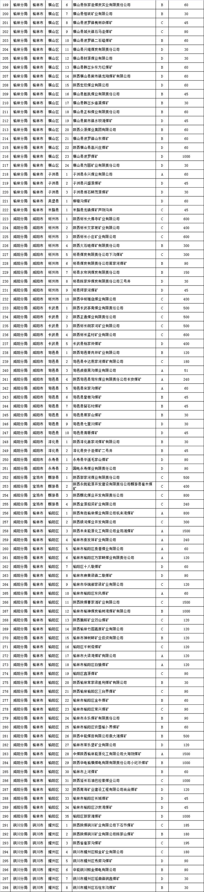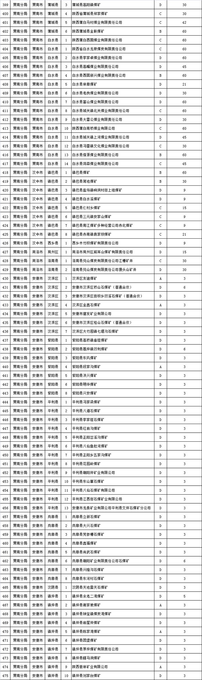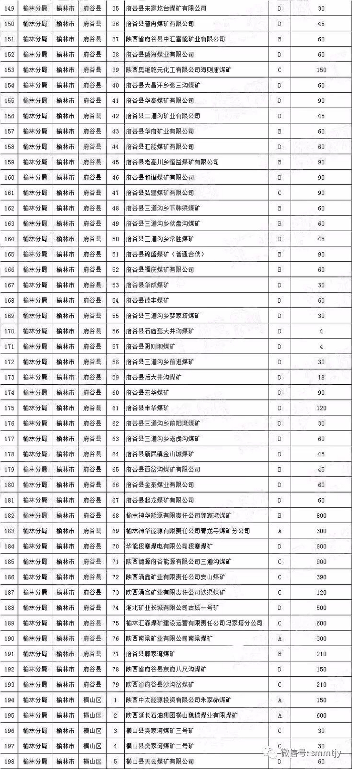 虽然复产煤矿数量逐渐增多,但主要以央企和省属煤矿为主。从今日起,民营煤矿陆续复工,主要从神木区域开始。 陕西省现有煤矿475处,长期停工停产煤矿占38%(附名单) 按照《国家煤矿安监局关于煤矿分类监管监察工作的指导意见》(煤安监监察〔2018〕15号)和陕西煤矿安全监察局、陕西省应急管理厅《关于修订<陕西省煤矿分类实施细则>的通知》(陕煤安监二发〔2019〕229号)要求,以安全风险管控为主线,综合考虑陕西省煤矿安全管理、灾害程度、生产布局、装备工艺、安全诚信、安全生产标准化建设、人员素质及生产建设状态等因素,按照安全保障程度从高到低将全省煤矿划分为A、B、C、D四类。其中:A类为安全保障程度较高煤矿,B类为安全保障程度一般煤矿,C类为安全保障程度较低煤矿,D类为长期停工停产煤矿。 全省475处煤矿分类结果公布如下:A类42处、生产建设能力16379万吨/年,B类142处、生产建设能力20880万吨/年,C类为安全保障程度较低煤矿112处、生产建设能力24856万吨/年,D类179处、生产建设能力11585万吨/年。 附2020年陕西煤矿分类明细: