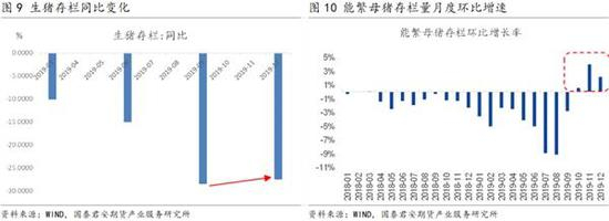 生猪进入复产周期,提升了后期猪肉供应增加的预期。据国家统计局1月19日通报数据,2019年四季度末全国生猪存栏31041万头,同比下降27.5%,环比增长1.2%。再根据1月8日农业部新闻发布会介绍:2019年12月份全国能繁母猪存栏环比增长2.2%,连续3个月环比增长,比9月份增长了7.0%。此外,规模猪场产能恢复更快。12月份全国年出栏5000头以上规模猪场生猪和能繁母猪存栏环比分别增长2.7%和3.4%,均连续4个月增长,能繁母猪存栏环比增幅高于全国平均水平。