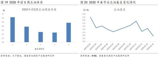 春节后豆油现货市场有价无市,初步验证了豆油需求加速弱化的逻辑。根据第三方调研数据,豆油现货成交量方面,2020年春节后10天,豆油现货总成交量1.856万吨,其中2月3日、6日和7日均是零成交,其余时间成交数量最低400吨,最高8700吨,还有3天成交均1000吨左右;对比2019年春节后同期情况,当时豆油总成交量约19.11万吨,日均成交约1.911万吨。提货量方面,据纳入统计的72家油厂数据,2020年春节之后第5天才开始有提货量统计,第5天至第9天日均提货量约8974吨;2019年春节后第2天至第9天日均提货量约1.72万吨。由此可见,2020年春节之后豆油现货需求大幅缩减,需求大幅下降之后带来的必然是库存的回升:截至2月10日当周,豆油周度库存89.69万吨,回升至1月初水平。因为库存周期其实是滞后于需求周期的,所以库存指标具有滞后性,目前豆油库存的上升只是处于初期,后期随着豆油需求寡淡、油厂为了增加豆粕供应而增加开机率,预计豆油库存将会进一步回升。豆油基差方面,春节之后豆油基差有所下降:我们以张家港四级豆油现货价格作为现货价格标的,期货价格以豆油主力2005合约收盘价作为标的,那么豆油基差从2月3日510元/吨下降至2月14日386元/吨,虽然目前豆油基差仍维持相对较高的正基差,但是由于豆油没有现货成交量,这种有价无市的情况不具备可持续性,所以豆油现货唯有降价才能换取部分成交量,至于降价多少才能换取成交量,仍要以下游市场的接受程度而定。