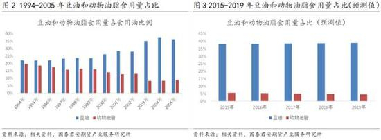 食用油包括食用植物油和食用动物油,两者之间具有一定替代效应。根据相关研究,1994年-2005年期间,我国动物油脂在食用油直接食用消费量占比从19.61%下降至8.88%,豆油比例则从22.14%上升至36.35%, 2001年起我国豆油直接食用量在食用油消费中超过菜油,成为第一大食用植物油,可见豆油等食用植物油对动物油脂具有替代作用。