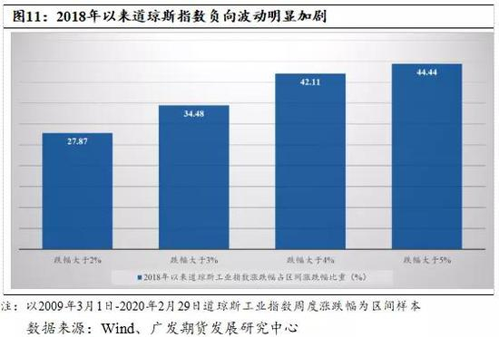 再者,疫情或进一步加大美国股市下行风险。次贷危机后,美股从2009年低点反弹,走出了10年牛市大行情,特朗普也将美股牛市归因于自己的政绩。事实上,股票市场的涨跌有其自身的规律,股市是经济的晴雨表。自2018年美国政府与全球主要贸易合作伙伴之间贸易关系恶化以来,美国股市波动显著加剧。以道琼斯工业指数为例,2018年以来,周度下跌次数占整个区间(2009.3-2020.2)比例随着下跌幅度加大而上升,表明美国股市2018年以来负向波动显著加大。