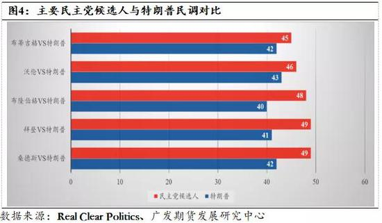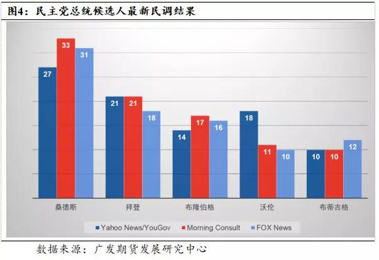 图4为特朗普和民主党五位主要竞选人的民调结果对比,从图中可以看出目前民主党五位竞选人的民调支持率均高于特朗普。
