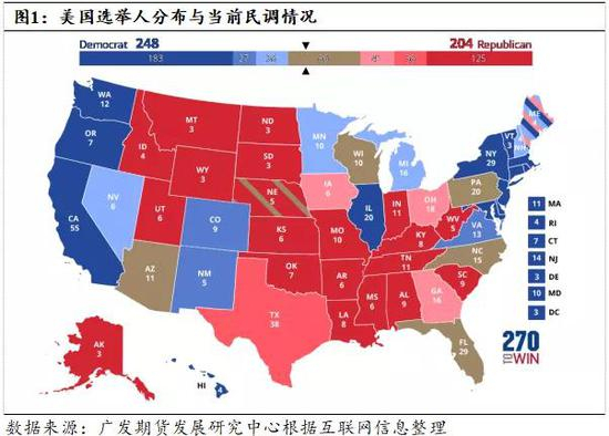 图1综合了Sabato‘s Crystal Ball、The Cook Political Report以及Inside Elections调查结果的各州的选举人票的民调数据,以及最新的美国大选民意调查情况。美国很多州都具有相对稳定的政治倾向,如图示深蓝色或深红色区域,分别为共和党与民主党最稳定的的传统票仓。而佛罗里达州、宾西法尼亚州等摇摆州的最终的投票结果往往将决定大选的走向。