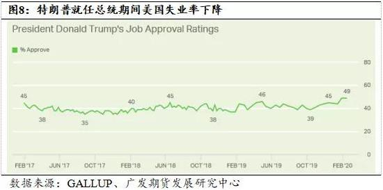 通过民意满意度分析可见目前特朗普的执政成绩仅能算是中规中矩,Gallup统计数据显示从1938年-2020年,美国总统平均民意满意度为53%,特朗普民意满意度最高仅为49%,甚至没有达到平均水平。换言之,在美国国内相当数量的民众对于目前现状感到并不满意,这恰恰也给2020年美国总统大选带来了非常大的不确定性。