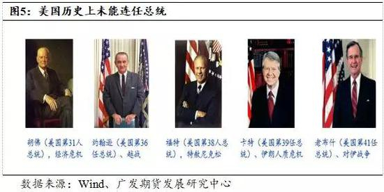 从历史上来看,美国总统连任的概率非常大,自1900以来,19位现任总统当中有14位顺利连任,连任概率达73.68%。国家经济状况往往影响现任总统能否胜任的关键因素,胡佛总统(美国第31人总统)、卡特总统(美国第39任总统)、老布什总统(美国第41任总统)三任总统在任时国内经济状况恶化,导致民众对于总统不满而未能顺利连任;福特总统(美国第38任总统)因无条件和完全赦免因“水门事件”下台的尼克松在他总统期间犯的任何罪行而在1976年总统连任大选中失利;而约翰逊(美国第36任总统)因使得美军深陷越战泥淖无法抽身而备受民众抨击和质疑,在后续总统选举中未能连任。