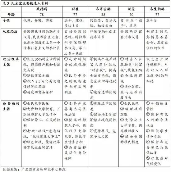 表3从多个维度对民主党主要候选人进行了比较。桑德斯是当前民主党最大的黑马,也是最具有特点的一位总统竞选者。桑德斯是一位民主社会主义者,也是美国历史上第一名信奉社会主义的参议员,但他并不属任何政党,故以独立人士身份出现在选票上。但由于加入民主党党团运作,故在委员会编排方面被算作民主党一员。桑德斯2016年曾参加总统竞选,在演讲中他提到要改善美国工薪家庭的生活情况,重建基础以提供更多的工作机会。要通过对富人增加税负,降低贫富差距,并扩大社会保障,为所有民众提供医保,降低学生的学费负担。他认为要让国家和党派为广大民众服务,就必须要有勇气挑战华尔街、保险公司、制药公司等权力垄断者。另外,桑德斯决心改变美国当金“砸钱”选举的不良格局,将民众政治诉求从财团的控制下解放出来。2016年这位74岁的老人在财力、年龄均不占优的情况下拒绝所有的大额度捐赠,但最后凭借着约800万人的小额助选,获得了约1300万人的投票,并赢下了全美23个州的支持,仅以细微的劣势败给了希拉里。