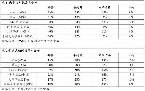 表1和表2显示了内华达州与卡罗莱纳州的投票分布情况。其中,内华达州为桑德斯的优势州,桑德斯在该州获得了24票,而卡罗莱纳州为拜登优势州,为其贡献了28票。尽管从绝对值上看,拜登与桑德斯在各自优势州得到各个层次的选举人投票也会更多,但各自选票结构存在明显差异。从人种上看,拜登获得了更多黑人的投票,而桑德斯则在白人选民中更具优势。从年龄分布上看,桑德斯更受年轻人追捧,而拜登在45岁以上的投票者中更具优势。而从教育程度上看,两位竞选人获得较低教育层次民众的支持度更高。