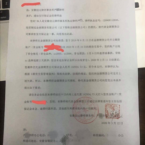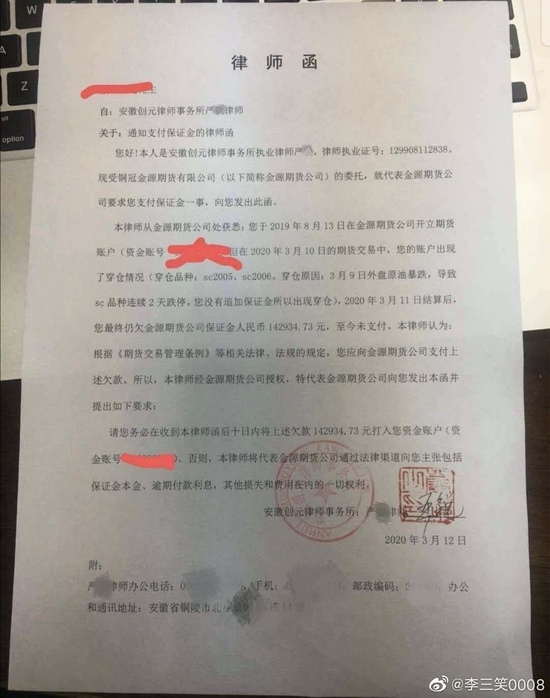 3月16日晚间,期货大v@李三笑0008在微博晒出一张律师函,根据大v爆料的律师函显示,有人在3月10日的期货交易中账户出现了穿仓情况,且未及时补足,在3月11日结算后,仍欠铜冠金源期货公司保证金人民币142934.73元,律师函要求在十日内补足欠款,否则将通过法律渠道主张。