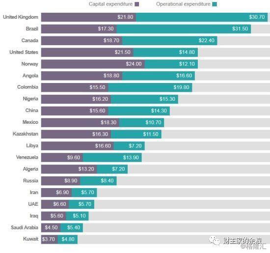 2016年初WTI原油的价格跌至30美元/桶以下的时候,有机构调查统计了全球20个主要产油国的原油生产成本(见下面的图片和表格,分为资本开支+运营支出两个部分)。