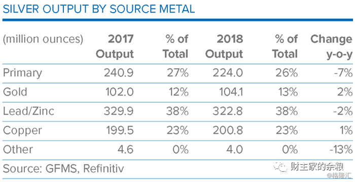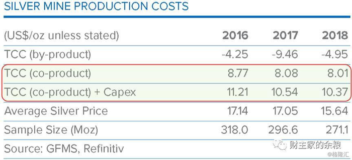 GFMS对于矿产白银生产成本统计并不区分区域,而是区分副产品(by-product)和主产品(co-product)的成本——在白银作为副产品而产出的时候,因为其现金成本费用已经全部摊销到其他主产品上(如铜、金、铅、锌等),所以其现金成本表现出来是负值,我们主要关心的,是白银作为主产品的生产成本。