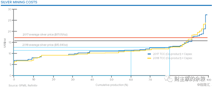 因为白银相比黄金的金融属性差了很多,而商品属性则强了很多,而且存在大量作为副产品而开采的伴生矿。所以,从生产成本角度我们将80%的白银共生矿产能,作为白银价格底部的第一阶段——其对应的2017年和2018年白银生产成本大约在12.8美元/盎司。