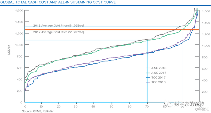 在《黄金年鉴2019年》中,GFMS对2017年和2018年不同矿业公司、不同生产成本的黄金产量占比进行了统计,并做出来了一个产能-生产成本曲线(图中纵轴为生产成本-美元/盎司,横轴为产能占比,红色和黄色横线分别为2018年和2017年的黄金平均价格,紫线和蓝线为2018年和2017年的TCC,灰线和绿线分别为2018年和2017年的AISC)。