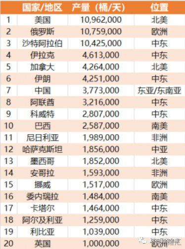 2018年全球有20个国家的原油产量超过了100万桶/天,其中美国、俄罗斯和沙特是大户,原油产量都超过了1000万桶/天;第二梯队的加拿大、伊拉克、伊朗、中国、阿联酋、科威特和巴西的原油产量也都超过了200万桶/天——这20个国家的原油产量,占了世界总产量的3/4。