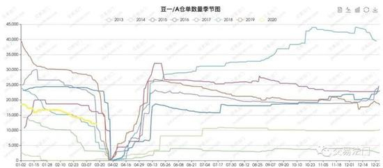 我们看有没有逼仓的可能性,首先要看一下实盘的货现在有多少,也就是说我们要关注一下仓单的情况。仓单较高,不太容易发生逼仓;仓单较低,发生逼仓的概率大一些。从豆一的仓单情况来看,今年的仓单处于历史偏低水平,大幅低于去年同期,当前的仓单水平基本上是 2015 那年以来同期最低水平,和 2018 年水平差不多。