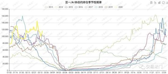 但是我们可以看一下豆一的持仓,A2005 合约 123376 手,次主力合约A2009 持仓 31206 手,持仓相差巨大,也就是说,主力合约一直没有移仓换月的意思,所以导致近远月主力合约在临近交割的时候,持仓相差巨大。