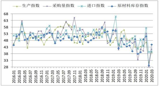 图4 2016年以来生产指数、采购量指数、进口指数和原材料库存指数变化情况