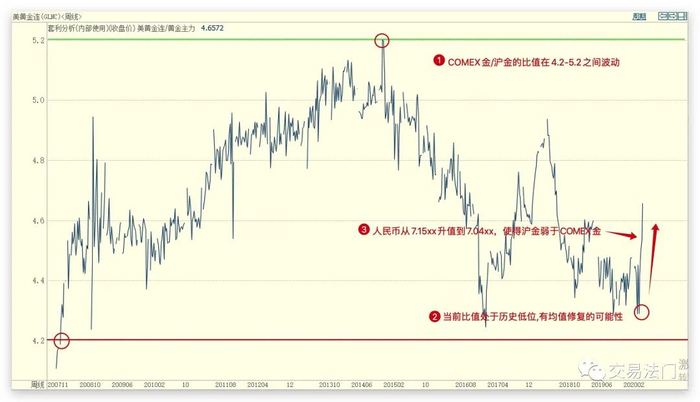从历史统计来看,我们可以得到第一个结果就是 COMEX 金/沪金的比值一般在 4.2 到 5.2 之间波动,这个区间可能是由于内外盘套利所导致的;我们还可以得到第二个结果就是,当下 COME 金/沪金的比值已经处于接近于 4.2 的历史低位,如果沪金再强于 COMEX 金,那么比值就向下可能突破 4.2 了,就可能存在内外盘套利机会,所以这个时候有均值修复的可能性。