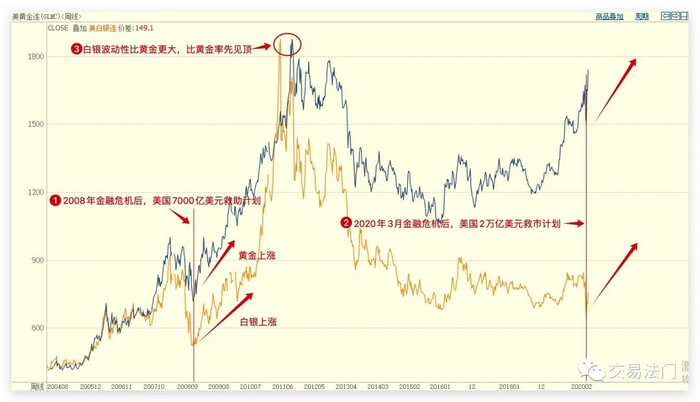 从图中,我们可以看到第一个情况是,在 2008 年金融危机爆发后,同年 10 月美国推出 7000 亿美金的救助计划,同时名义利率基本上也接近于零,和当下的情况有些类似,此后我们发现黄金和白银在 10 月见底之后,双双开启了长期上涨行情。