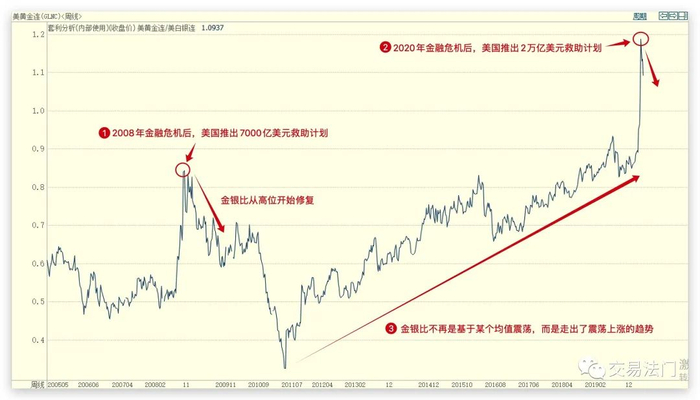 当然,我们还是从历史的角度对比一下 2008 年和当下的金银比的走势情况,以及对于金银比均值回归问题的看法。我认为,金银比会修复,但绝对不是所谓的历史均值修复。