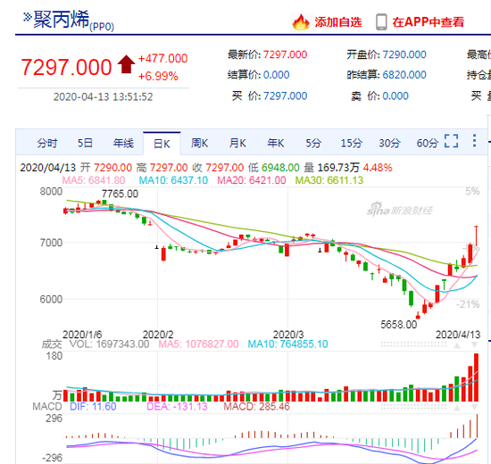 4月13日,聚丙烯主力合约午后涨停,涨幅近7%,报7297元/吨。