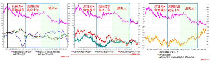 1991年3月—2001年6月,美国经济呈现出高增长、低通胀和低失业率的特点,一般认为是信息技术革命导致劳动生产率水平的提高,在推升经济增长的同时,降低了生产成本、拉低了物价。这十年经济增长良好并不是财政或者货币政策刺激的结果。良好的经济造就了美股十年大牛市和美元走强,黄金在这一阶段整体较弱,也没有明显的长期交易机会。其中1995年以后美元走强也对金价产生了直接的压力。