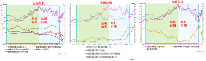 2007—2008年底的金融危机过程,这一阶段金价大幅波动,受利率、避险等各种因素驱动,较难界定危机前期/后期,交易价值有限;