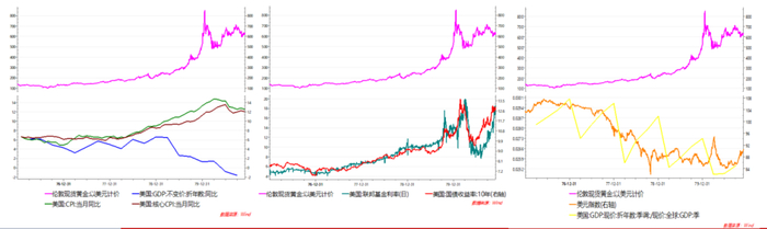 2)1973-1975年第一次石油危机(第三次中东战争,OPEC联手打以色列)使油价暴涨,美国CPI和核心CPI同比一度超过10%,美联储加息企图抑制通胀,结果不仅没效果,还把经济增长压了下去 ,这是最有利于黄金价格的状态。1974年降息,经济增长回升,通胀下降。