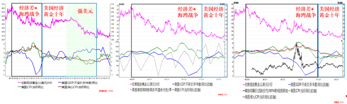 海湾战争:1990年8月2日凌晨伊拉克侵入科威特,2日下午8时,美国宣布发起“沙漠盾牌”行动,并于1991年1月17日轰炸巴格达,正式爆发“海湾战争”。海湾战争前后推升了油价和通胀,也使得美国经济增长压力加大,微弱的避险需求和衰退预期缓解支持金价,但金价整体仍弱,而且这种衰退和事件驱动通胀相反作用的情况交易起来很难。
