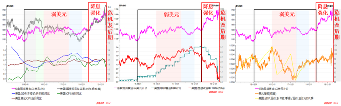 1)2015年12月-2019年5月通胀稳定,经济增长带动加息操作,使得实际利率小幅波动,期间2017年1月-2018年3月黄金上涨很大程度来自弱美元的支撑。