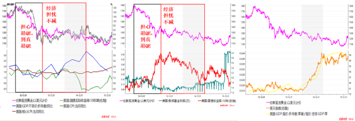 2)2013年四季度开始到2015年初,尽管经济增长上升,但对经济担忧仍在,基准利率维持低位,美债长端名义利率下降,但通胀预期收缩,实际利率小降,甚至在2014年下半年美元指数开始上涨的情况下,名义和实际长端利率也未上升,黄金价格震荡走弱。