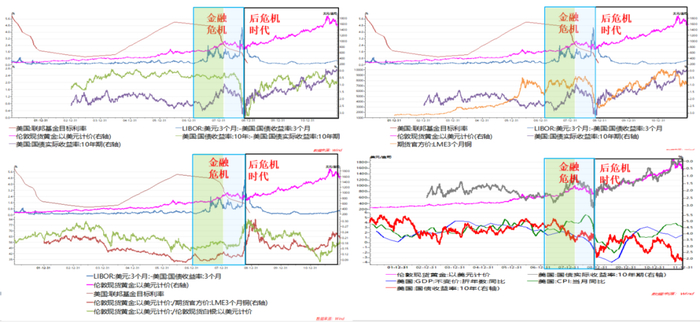 2008年10月两次降息后,随着TED利差回落,进入漫长的后危机时代,尽管对经济增长和通胀的冲击才刚刚开始体现,但是避险需求、通胀预期回升等因素依次发挥作用,使得低利率环境下,金价持续上涨,实际利率等因素是主驱动。