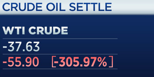 新浪财经讯 4月21日消息,NYMEX WTI5月原油期货结算价收报-37.63美元/桶,历史上首次收于负值,下跌55.9美元,跌幅305.97%。即将到期的美国WTI 5月原油期货合约以大跌收盘,创下近月合约历史最低收盘水平和最大单日跌幅,反映出原油供应日益过剩和库存空间不足的问题。