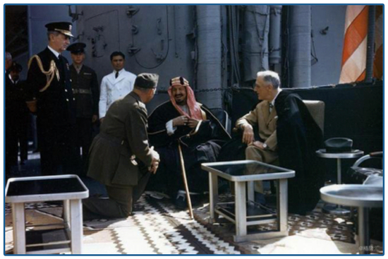 (1945年,沙特国王阿卜杜勒阿齐兹与美国总统罗斯福在昆西号巡洋舰上秘密会面,商谈战后两国关系以及国际能源格局等问题)