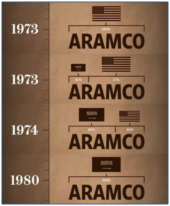 与此同时,沙特收回阿美的计划也一直有条不紊的进行着,他们很顾及和美国的关系,中东世界一般都是直接粗暴的把一些西方石油公司收归国有,而沙特采用的是收购股份的方式,终于在1980年3月,把美国人的股份全收到自己手里,终于可以独享这么好一个印钞机了。