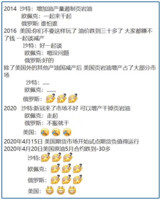 目前主角有三个,美国、沙特、俄罗斯,有网友总结了下情节,大概就是这样的: