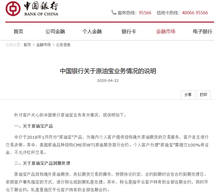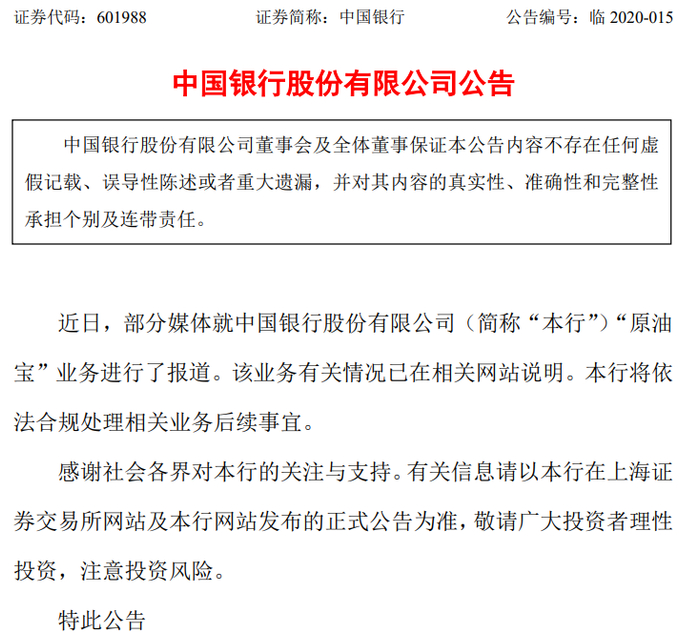 随后,中国银行发布公告称,近日,部分媒体就中国银行“原油宝”业务进行了报道。该业务有关情况已在相关网站说明。中国银行将依法合规处理相关业务后续事宜。