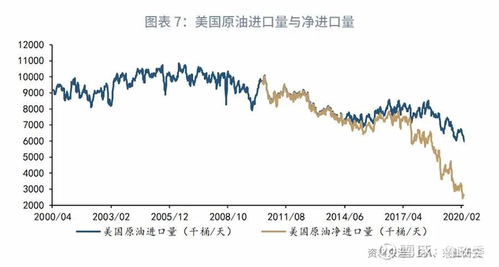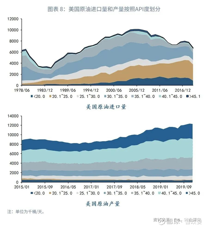 2.1 北美原油产量激增,对沙特依赖度下降从1.2章节美国分国别原油进口量中可以看出,1970年以来的美国原油进口格局在2009年之后开始发生明显变化,这一时点正对应美国页岩油产量崛起、且同时期加拿大原油产量也开始快速增长之际。2008年后美国和加拿大原油产量一同快速增长,使得美国对于北美外的沙特和委内瑞拉依赖程度下降,而北美三国间的原油依存度增强。不过因为美国的原油基本为轻质原油[1],需要和中质原油和重质原油混合后才能进入炼油装置。所以虽然美国2016年出口禁令解除以来出口量快速增长,并且自2017年以来原油净进口量快速下降,但原油进口量并没有呈现出同等程度的下降。这就是因为其国内生产油种品质与进口油种品质的结构性差异。而且虽然美国已经成为石化液体的净出口国,其对于中质和重质原油的进口需求仍将长期存在(详见图表 7和图表 8)。