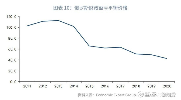 从国家财政平衡成本而言,沙特高于俄罗斯。美国外交关系协会的数据显示,随着沙特近几年国内致力于产业多元化的改革,2018年来沙特的财政盈亏平衡成本有所下降,从2018年的88美元/桶下降至2020年的76美元/桶(预估)。其外部平衡成本[2]自2016年起就基本维持在48至50美元/桶。而在2014至2015年油价暴跌带来的新兴市场危机之后,俄罗斯也致力于国内的改革。根据俄罗斯Economic Expert Group的统计数据显示,其财政平衡油价从2015年起出现显著下降。2019年时,这一数据已经从2015年的65.6美元/桶降至49.2美元/桶(详见图表 9和图表 10)。所以可以发现2017年沙特和俄罗斯联合减产以来,减产谈判时,沙特对于减产的态度要远比俄罗斯积极。