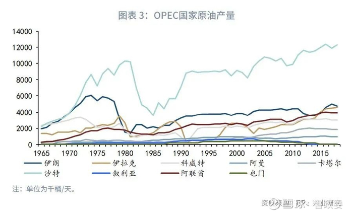1.1 与中东产油国建立密切联系20世纪70年代之前,美国是全球原油产量最高的国家,连续多年原油产量全球第一,排名第二的是当时的前苏联,第三、第四名分别为委内瑞拉和科威特,而沙特原油产量在当时只排名全球第五,而且只有美国当时产量的25%。20世纪四五十年代,中东地区两次石油资源的大发现,使得这一地区在后来一跃成为全球最受瞩目的原油出口地。1965年,现任OPEC成员国中,委内瑞拉产量位居第一,科威特、沙特以及伊朗产量基本相当。进入20世纪70年代之后,沙特产量快速增长,一跃成为OPEC成员国中产量最大的国家。而且正值当时全球第一大原油需求国美国国内产量见顶回落以及需求大爆发之时,对于进口的需求激增。美国亟需寻找外部石油供给来源,而当时正处于美苏对峙的阶段,所以美国的关注对象自然而然就落在了当时新崛起的中东产油国。