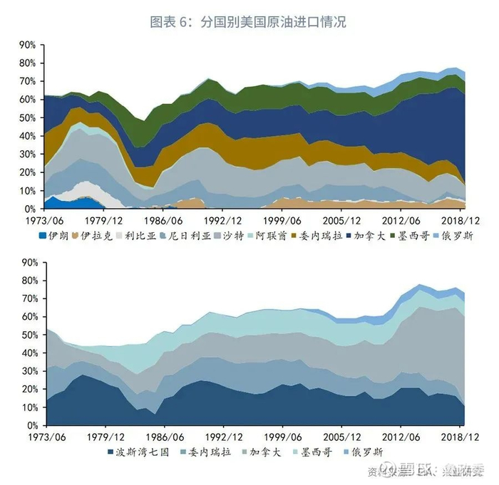 而伊朗和俄罗斯,在美国的进口占比中一直很小。1978年美国和伊朗反目之前,美国还曾自伊朗进口过原油,但此后进口量几乎均维持在0值附近。而在前苏联时代,美国自苏联进口的原油屈指可数;2002年之后,进口量有所提升,但总体仍持低位(详见图表 6)。